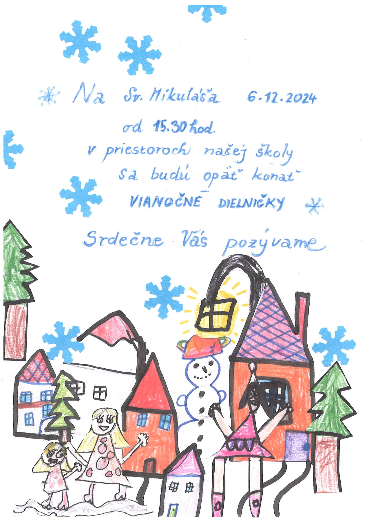 Srdečne Vás všetkých pozývame na naše tradičné Vianočné dielničky, ktoré sa uskutočnia v piatok 6.12.2024 od 15,30 v priestoroch Základnej školy.